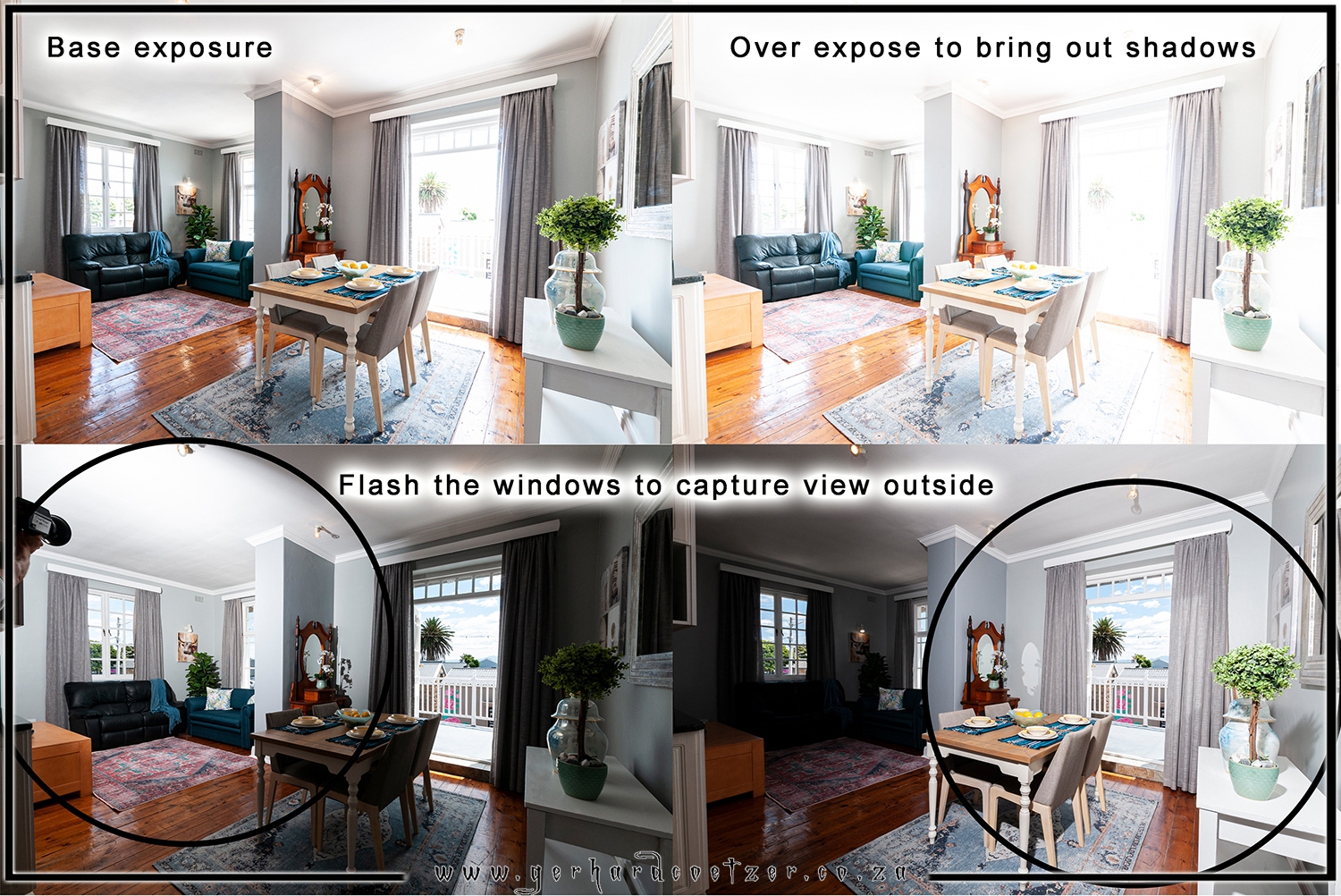 _2_ Why a studio light? (Sometimes the technique is referred to as a window pop) The transition from bright to dark around a window or door can be extreme. This is where a studio light comes in. To create a photo exposed for the bright sunlight outside, will leave the room dark or underexposed, so the studio light is set to balance the exposure. But flash image alone will cause unnatural shadows, therefore is used together with other exposures.